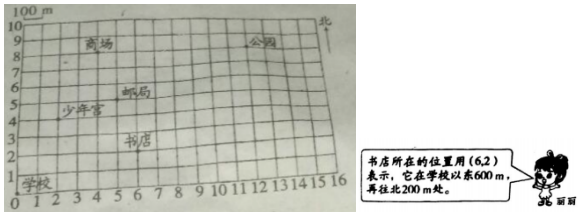 邮局所在的位置用( )表示,它在学校( ),再往( )处。