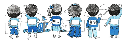 ②乐乐:站在贝贝的右边,冬冬的左边。