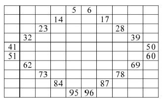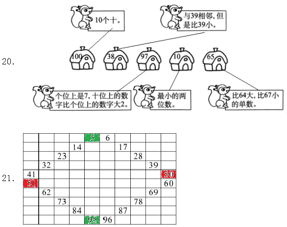 21.给十位上是5的数涂上红色,个位上是5的数涂上绿色,个位和十位上的数字相同的数涂上黄色。