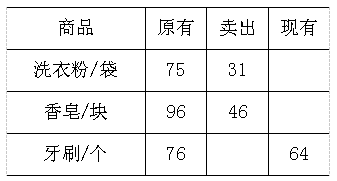 6.洗衣粉:75-31=44(袋) 香皂:96-46=50(块) 牙刷:76-64=12(个)
