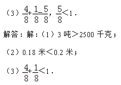 点评:不同单位的名数的大小比较通常是先化成相同的单位名数,再根据整数或小数或分数的大小比较方法进行比较.算式的大小比较通常是口算或估算出结果再根据结果进行比较,或先找规律或性质,然后再根据规律或性质进行比较.