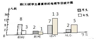 (1)喜欢动画节目的人最多,所以动画最受四(1)班学生欢迎喜欢,男生最喜欢科幻电视节目;