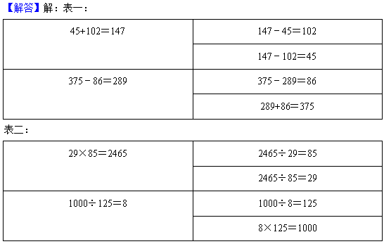 故答案为:147﹣45=102,147﹣102=45,375﹣289=86,289+86=375,2465÷29=85,2465÷85=29,1000÷8=125,8×125=1000.