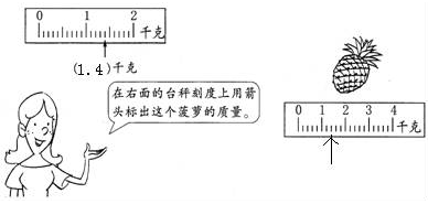 【解答】解:有分析可得,菠萝的质量是1.4千克,1.4千克在右面台秤的位置如下,
