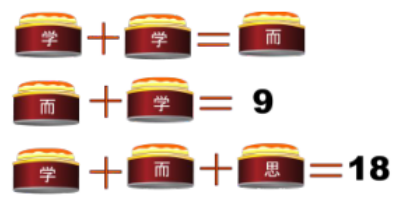 【解析】由第一个式子,“而”和两个“学”一样大,所以由第二个式子,三个“学”和9一样大,那么“学”就是3,“而”就是6,由第三个式子,“思”是9.