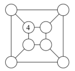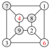 18.请把数字1、2、3、4、6、7、8、9填入右图的圆圈中(数字不能重复,其中4已经填好),使得任意两个有线段直接相连的圆圈内的数字之差都大于2.(注意:没有5!)