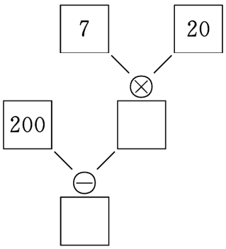 3. 艾丽卡买了 7 本练习本,每本 20 欧分,她用一枚 2 欧元的硬币付钱,应找回多少欧分?凯姆用下面的计算图来表示计算步骤,请你帮他填一填,并列式计算。(1 欧元=100 欧分)(6 分)