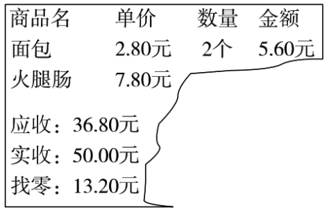 2. 下面是李奶奶在某超市买完东西后的购物小票,她不小心撕掉了一部分, 请你算一算,李奶奶买了几根火腿肠?(5 分)