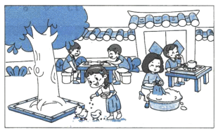 2.示例:周六早上,我在院子里喂鸡,哥哥在喝茶,妈妈在旁边洗衣服,爸爸和爷爷在下棋,大家都很愉快。