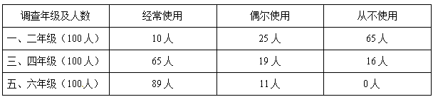 调查年级及人数经常使用偶尔使用从不使用一、二年级(100人)10人25人65人三、四年级(100人)65人19人16人五、六年级(100人)89人11人0人材料二:由于时代的不同,人类的语言也日渐丰富,网络新词也快速席卷校园,它正如一场新的“文化大爆炸”一般,在校园中“炸”开了。像“锦鲤”“官宣”“逆袭”等网络新词,许多学生口中时常说着,作文里偶尔用着,俨然成为校园里的又一“时尚”。