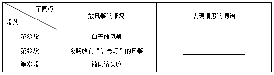 3.第④~⑥段写的都是放风筝,其内容不同在哪里? 从语段中找出表现“我们”心情变化的四字词语,根据提示将表格填写完整。(3分)