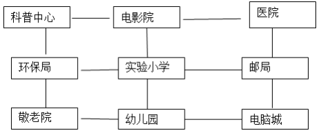 科普中心在实验小学的________面,电脑城在实验小学的________面。