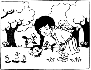 十一、春天到了,小草绿了,树也绿了,花儿也开了。小红来到树林和一群小鸟玩,小红弯着腰,鸟儿在她的背上往下滑,飞到她的辫子上荡秋千。鸟儿高兴极了,小红也十分开心。