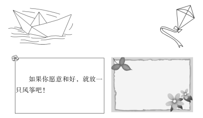 为了和小熊和好,松鼠在纸船上写了一句话,并将纸船漂给了小熊。小熊也想写一张卡片,挂在风筝上送给松鼠。请你帮帮他,在下面的卡片上写一写吧!