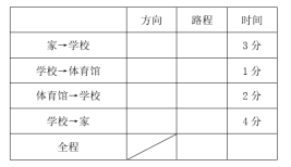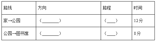 (1)根据上面的路线图,说一说小勇从家去体育馆和回来时所走的方向和路程,并完成下表。