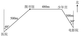 9路公交车先从电影院出发,向北偏(________)(________)°方向行驶(________)m到达少年宫,再向西行驶480m到图书馆,最后向(________)(________)°方向行驶(________)m到达医院。