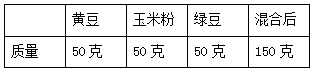 (2)实验:黄豆、玉米粉、绿豆以及他们的混合物,我们采取用天平秤得黄豆、玉米粉、绿豆的质量,然后与混合物的质量进行比较。(1分)