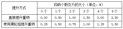 (2)小明用这个滑轮组来提升不同重量的钩码组。他测量提升重物时的用力大小,并与直接提升重物作数据比较,如下表所示。
