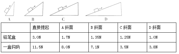 1.小明用(下图)四个斜面进行了省力情况的实验研究,并把相关数据记录在下表中。按要求回答问题。