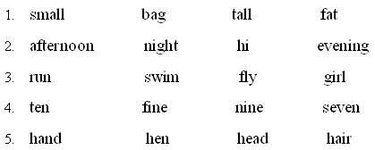 6.hair 7. ride 8.bag 9.tall 10. swim