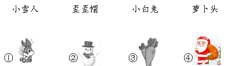 九、1.小雪人——② 歪歪帽——④ 小白兔——① 萝卜头——③
