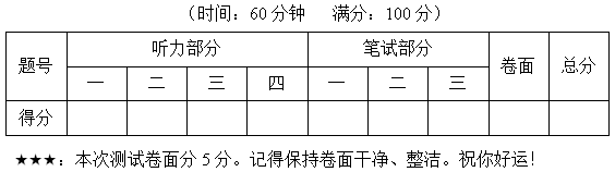 一、听录音,选出你所听到的单词。每小题读两遍。(每小题2分,共10分)