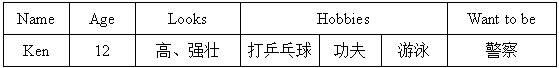 三、[示例] Ken is my friend. He is 12 years old. He is very tall and strong. He likes playing ping-pong and doing kung fu. He likes swimming, too. He wants to be a police officer in the future.