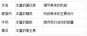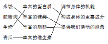 【解答】米饭有丰富的糖类;肥猪肉有丰富的脂肪;牛奶有丰富的蛋白质;青瓜有丰富的维生素。蛋白质:构成身体的主要成分;糖类:提供给我们活动的能量;维生素:调节身体的机能;脂肪:提供给我们活动的能量。