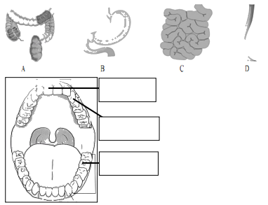 (3)人的消化道包括:口、咽、食道、胃、小肠、大肠、肛门等。通过观察和分析,发现图中的A是大肠,不能消化食物,但能吸收水、维生素等;B是胃,能初步消化蛋白质;C是小肠,是消化和吸收的主要场所;D是食道,将食物推入胃。所以食物从口腔出发,依次经过的是D食道→B胃→C小肠→A大肠。