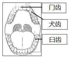 ①请把各类牙齿的名称填在方框中。