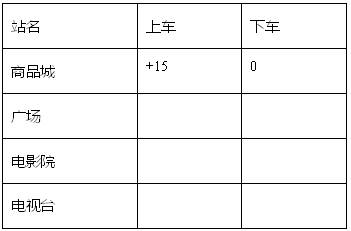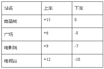 商品城上车15人。广场下车8人,上车6人。电影院下车7人,上车9人。电视台下车10人,上车12人。