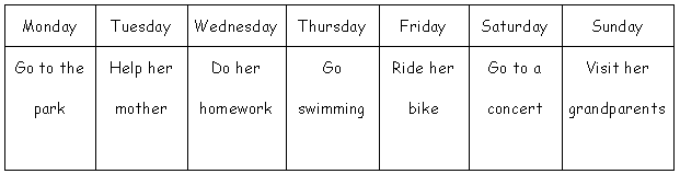 下个星期就要放假了,Lily已经做好假期计划,在周一她要去公园和朋友玩,在周二她帮助妈妈,在周三她要做她的家庭作业,在周四她要去游泳,在周五去骑她的自行车,在周六她要和父母一起去听音乐会,在周日她将去探望她的祖父母。