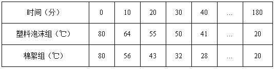 分析上表的数据可知:他们实验时的室内温度是________。40分钟后,用塑料泡沫包着的烧瓶中的水温降低了________,用棉絮包着的烧瓶中的水温降低了________。