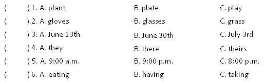 第一大题:听句子,选择你听到的单词或短语,将其序号填入题前括号内。