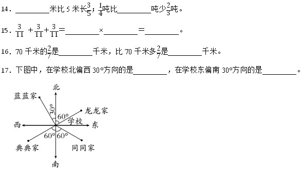 4.少年宫在银行的南偏东30°方向2000米处,从少年宫到银行需要向( )方向走2000米。