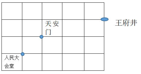 3、如图是天安门广场周围的景点分布示意图的一部分,如果王府井的位置用数对表示为(6,7),人民大会堂的位置用数对表示为(2,5),则天安门的位置用数对表示为( )。