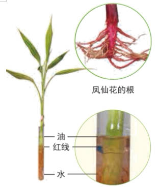 1、选择一棵带根的植物放入有红色水的试管中。将植物的根浸泡在试管的水中,在水面上滴些植物油,并在水面处做好标记。观察试管中的水位的变化。