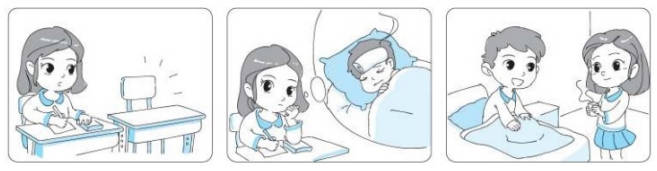 六、 示例:星期一上午,红红发现 同学明明没来上学。她想: 明明怎么没来上学呢?是不 是生病了?放学后我去看看 他吧,顺便给他讲讲今天新 学的课文。放学后,红红来 到明明家。她倒了 一杯热 水,端到明明的床前。明明 坐起来接过水,感动地说: “谢谢你,红红。”红红笑着 说:“不客气,先喝点水, 一会 儿我给你讲讲今天的习内容。”明明高兴地点了点头
