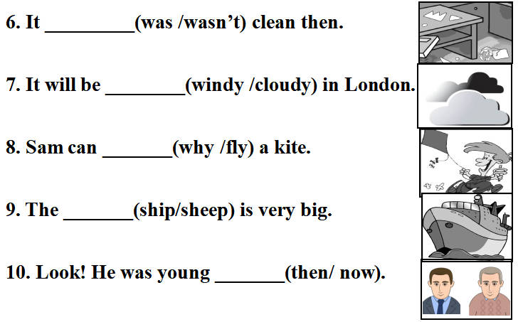 Ⅱ.(6 -10)读句子, 根据图片选择合适的单词填写在横线上。