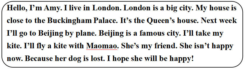 Hello, I’m Amy. I live in London. London is a big city. My house is close to the Buckingham Palace. It’s the Queen’s house. Next week I’ll go to Beijing by plane. Beijing is a famous city. I’ll take my kite. I’ll fly a kite with Maomao. She’s my friend. She isn’t happy now. Because her dog is lost. I hope she will be happy!