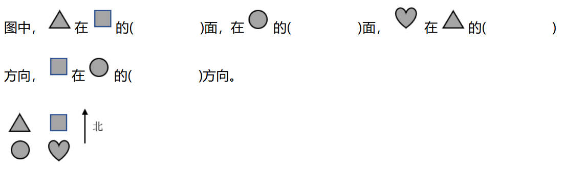 (1)大门在熊猫馆的( )面;金鱼池在长颈鹿的( )面,在天鹅湖的( )方向;熊猫馆在大象馆的( )面;天鹅湖在大门的( )方向。