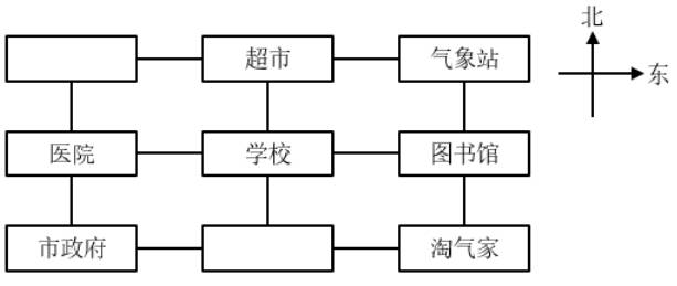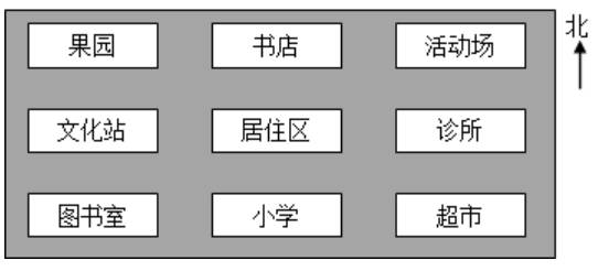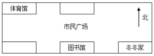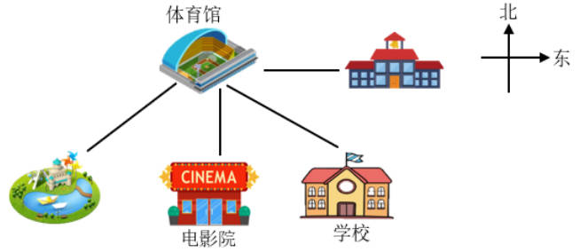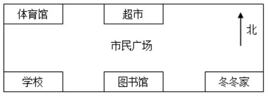 学校在市民广场的西南方向,超市在体育馆的东面。