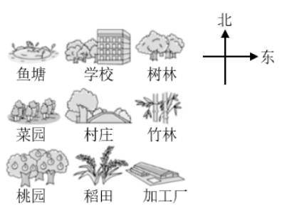 (2)稻田在菜园的( )方向,鱼塘在加工厂的( )方向,桃园在树林的( )方向。