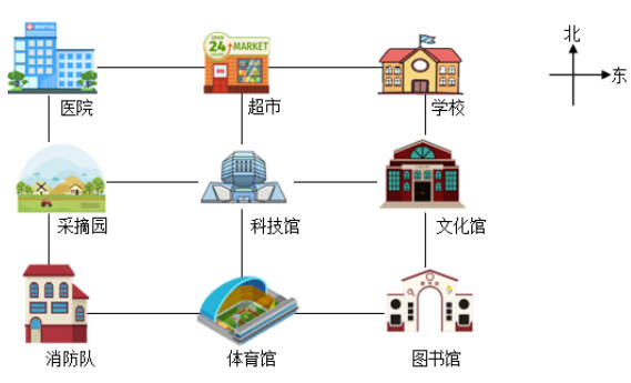 (2)学校在科技馆的( )方向,图书馆在科技馆的( )方向。