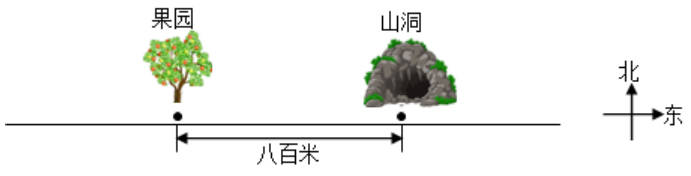 车站在果园西面四百米,清水湖在山洞东面三百米。