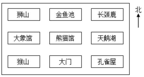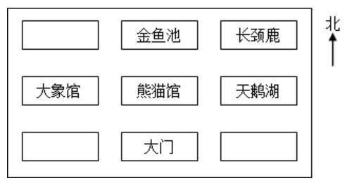 狮山在大象馆的北面,孔雀屋在熊猫馆的东南方向,猴山在熊猫馆的西南方向。