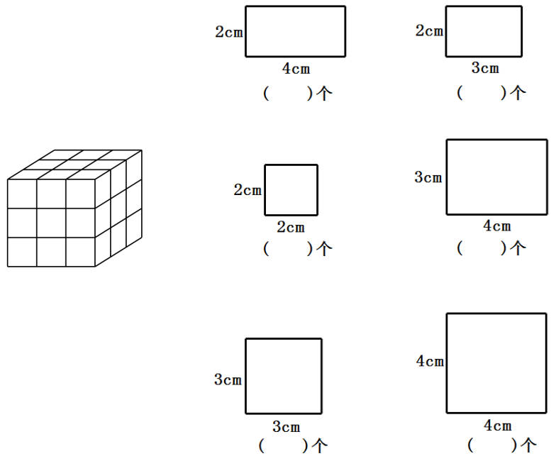 五、下图是用棱长1cm的小正方体拼成的长方体。右边的图形哪一个是这个长方体6个面中的一个?用“√”标出来,并注明有几个这样的画。(6分)