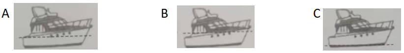 6.下列是三艘同样大小的船,图中的虚线是水位线,那么装的货物最重的是( )船。