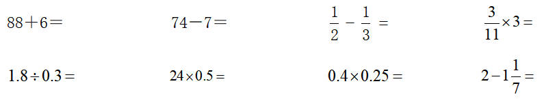 1、直接写出得数。(每小题1.5分,共12分)