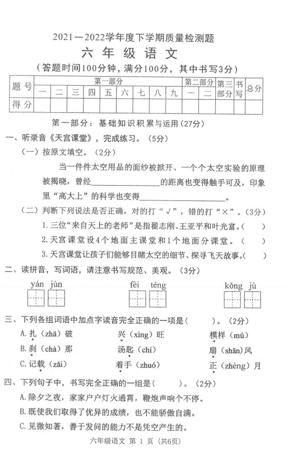 二、严峻 沸腾 恐惧 每对一字得0.5分,共3分